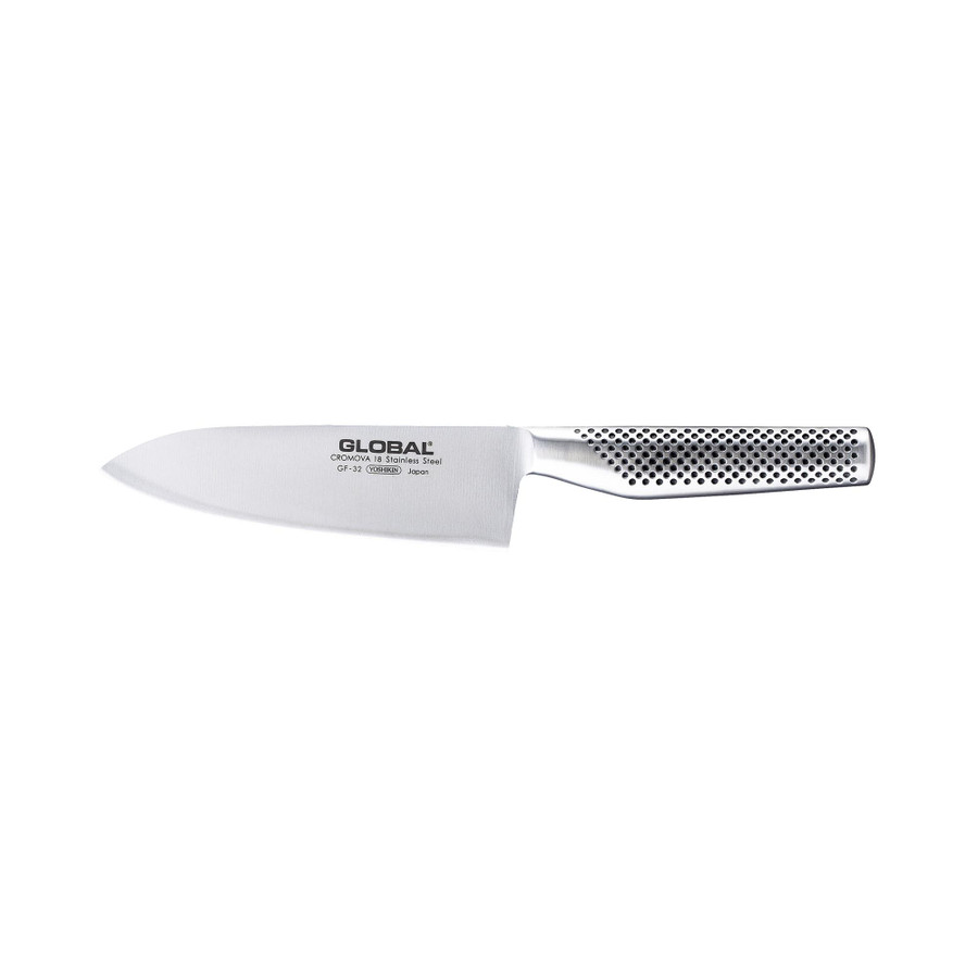 The GF-32 is made from forged CROMOVA 18 stainless steel, specially developed by GLOBAL® as it holds a razor-sharp edge and resists rust, stains and corrosion. Ice tempered and hardened to Rockwell C56-58, each knife is carefully weighted by filling the handles with sand to achieve the optimum weight and perfect balance. Other unique features include its smooth contours and seamless construction which eliminates food and dirt traps offering the ultimate in safety and hygiene. The acute 15-degree angle cutting edge provides unsurpassed performance and superior edge retention.